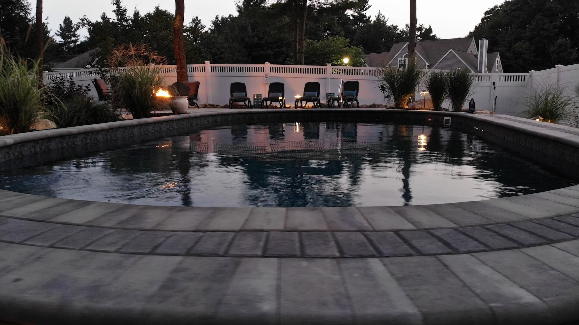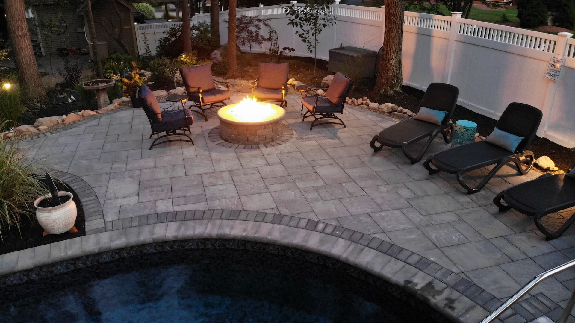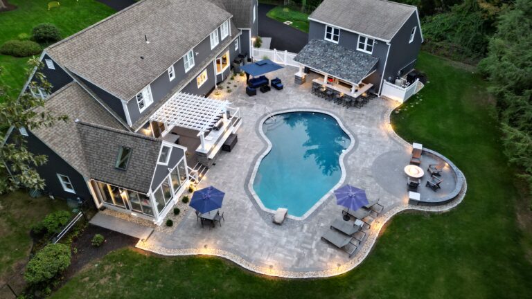 This Middleton, MA homeowner dreamed of transforming their challenging backyard into a private oasis. Despite the tight property lines and uneven terrain, our design team rose to the occasion, crafting a space that feels both luxurious and exotic. We recommended a radiant / vinyl liner pool installation for its incredible versatility. Vinyl Liner pools allow for placement above ground, in-ground, or semi-inground which proved to be the perfect solution for navigating the site’s unique contours.