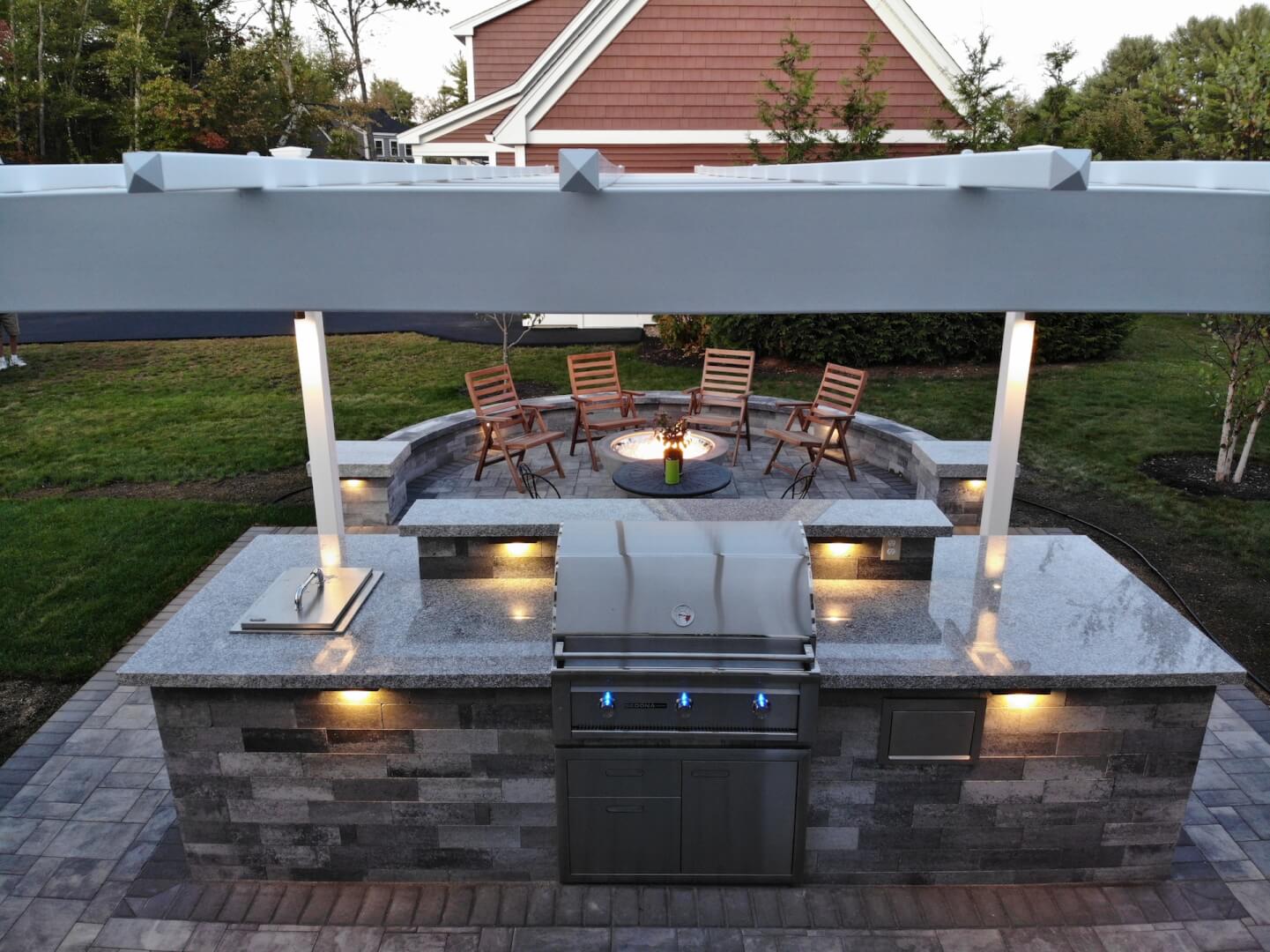 Located on the scenic Rockingham Country Club in Newmarket, NH, this project focused on maximizing limited space for outdoor entertaining. We designed and built a custom outdoor kitchen with bar seating, a pergola for shade, and a sitting wall with gas fire pit, perfect for post-golf gatherings. The space was finished with elegant landscape lighting and low-maintenance plantings, creating a functional and stylish retreat. Ideal for anyone searching for outdoor living design in New Hampshire or a reliable landscape and pool contractor near Newmarket NH.